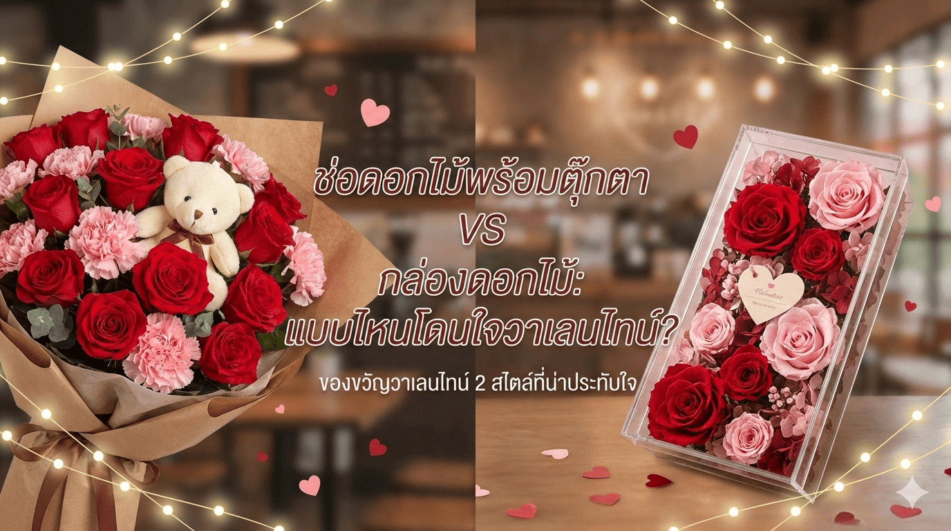 ช่อดอกไม้พร้อมตุ๊กตา กับ กล่องดอกไม้ แบบไหนเหมาะเป็นของขวัญวันวาเลนไทน์มากกว่า